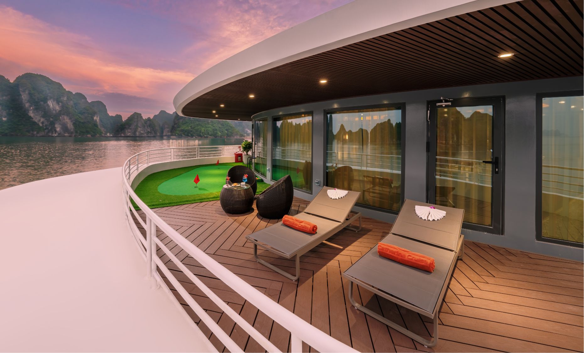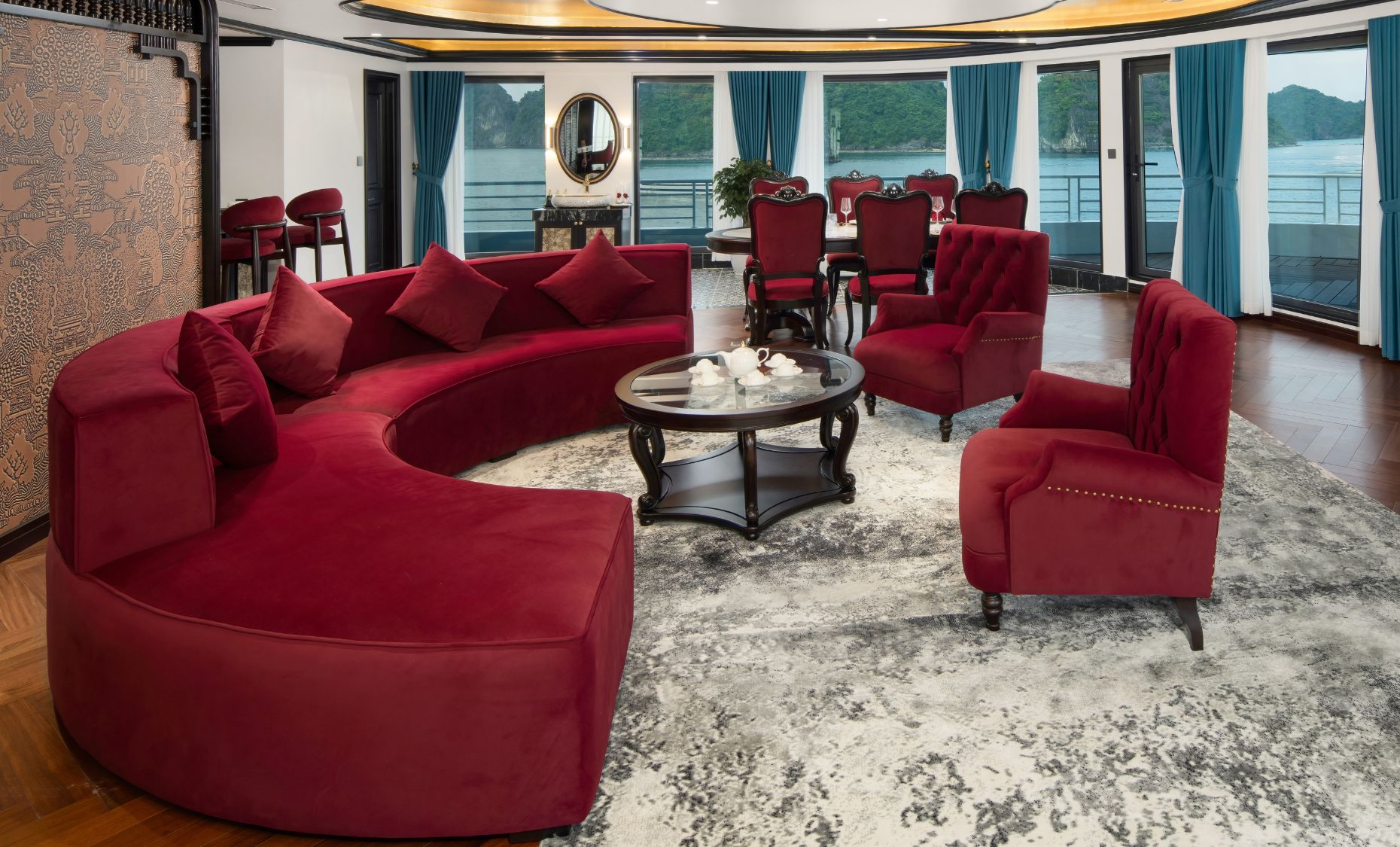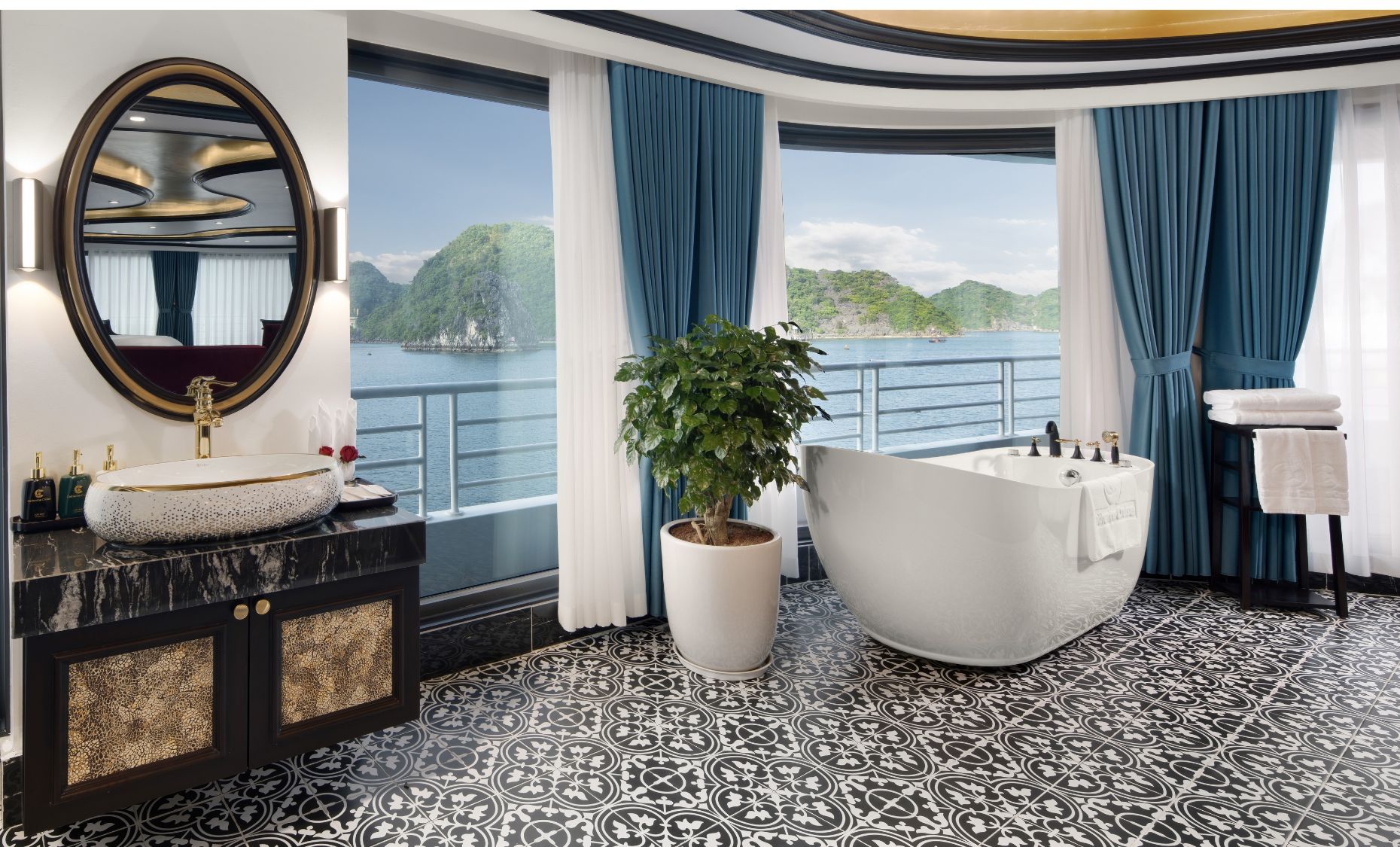Các phòng nghỉ có diện tích từ 40m2 đến 200m2 đều sở hữu ban công riêng và bồn tắm view Vịnh tuyệt hảo. Nội thất trong phòng và các khu vực tiện ích của du thuyền được thiết kế đồng nhất theo phong cách Indochine, là sự giao thoa hoàn hảo của tinh hoa kiến trúc Đông – Tây kết hợp cùng phòng cách Á Đông đầy nghệ thuật.