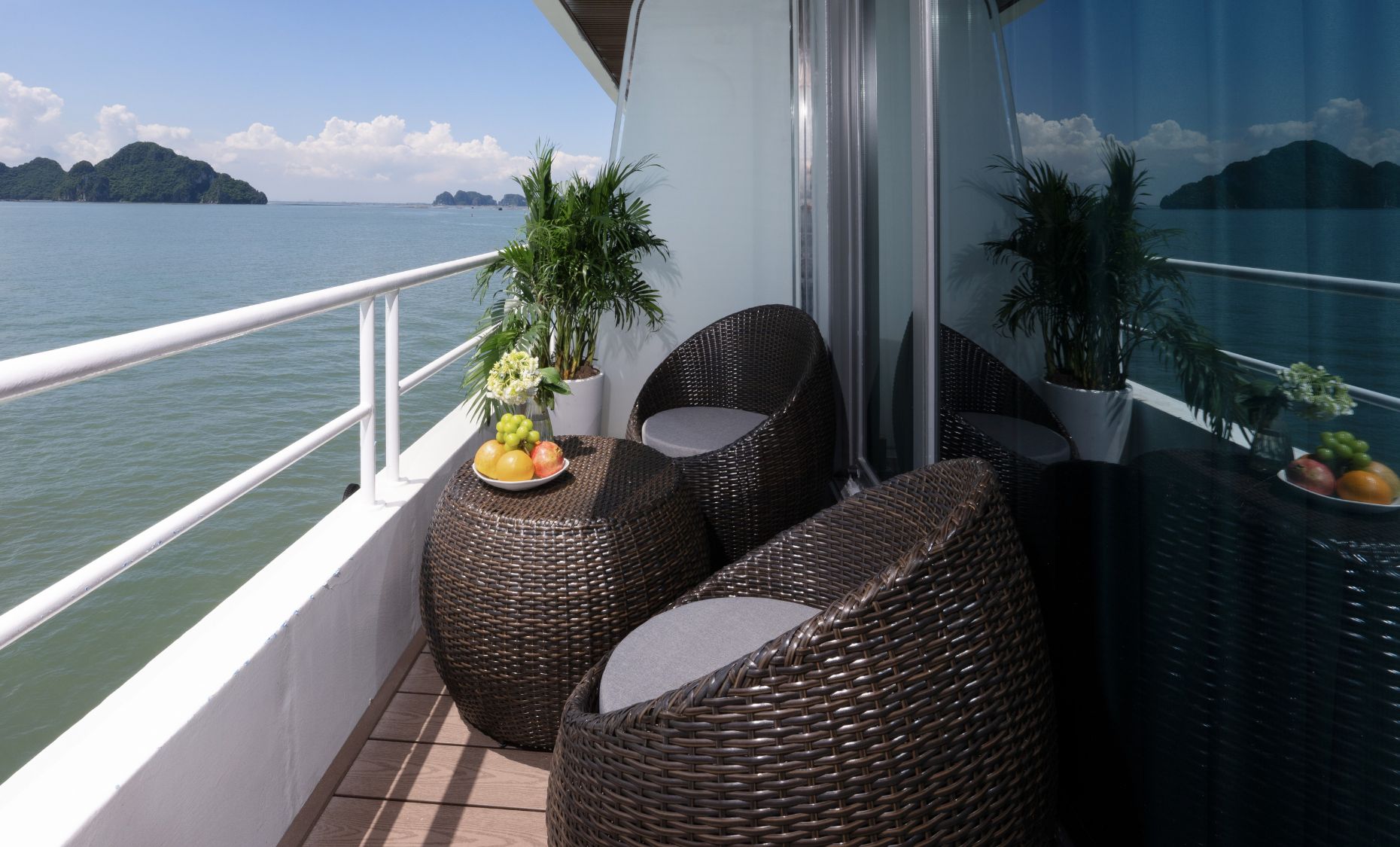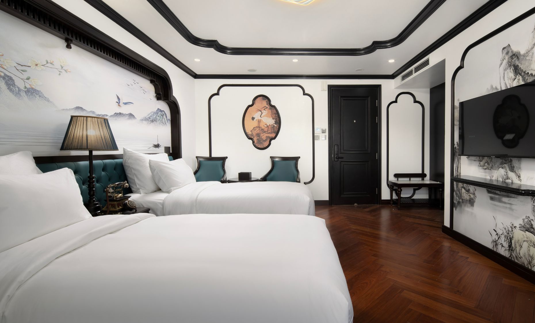 Các phòng nghỉ có diện tích từ 40m2 đến 200m2 đều sở hữu ban công riêng và bồn tắm view Vịnh tuyệt hảo. Nội thất trong phòng và các khu vực tiện ích của du thuyền được thiết kế đồng nhất theo phong cách Indochine, là sự giao thoa hoàn hảo của tinh hoa kiến trúc Đông – Tây kết hợp cùng phòng cách Á Đông đầy nghệ thuật,