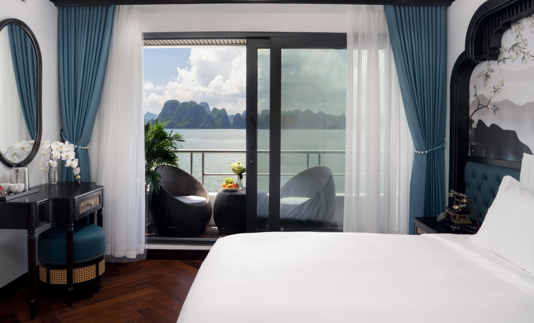 Các phòng nghỉ có diện tích từ 40m2 đến 200m2 đều sở hữu ban công riêng và bồn tắm view Vịnh tuyệt hảo. Nội thất trong phòng và các khu vực tiện ích của du thuyền được thiết kế đồng nhất theo phong cách Indochine, là sự giao thoa hoàn hảo của tinh hoa kiến trúc Đông – Tây kết hợp cùng phòng cách Á Đông đầy nghệ thuật.