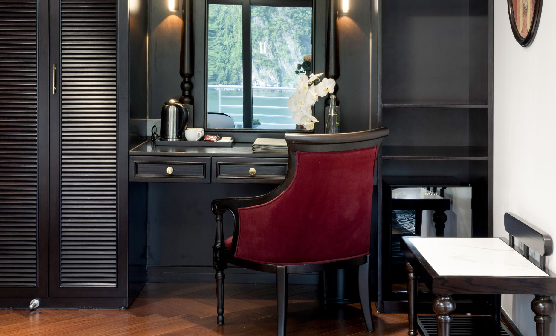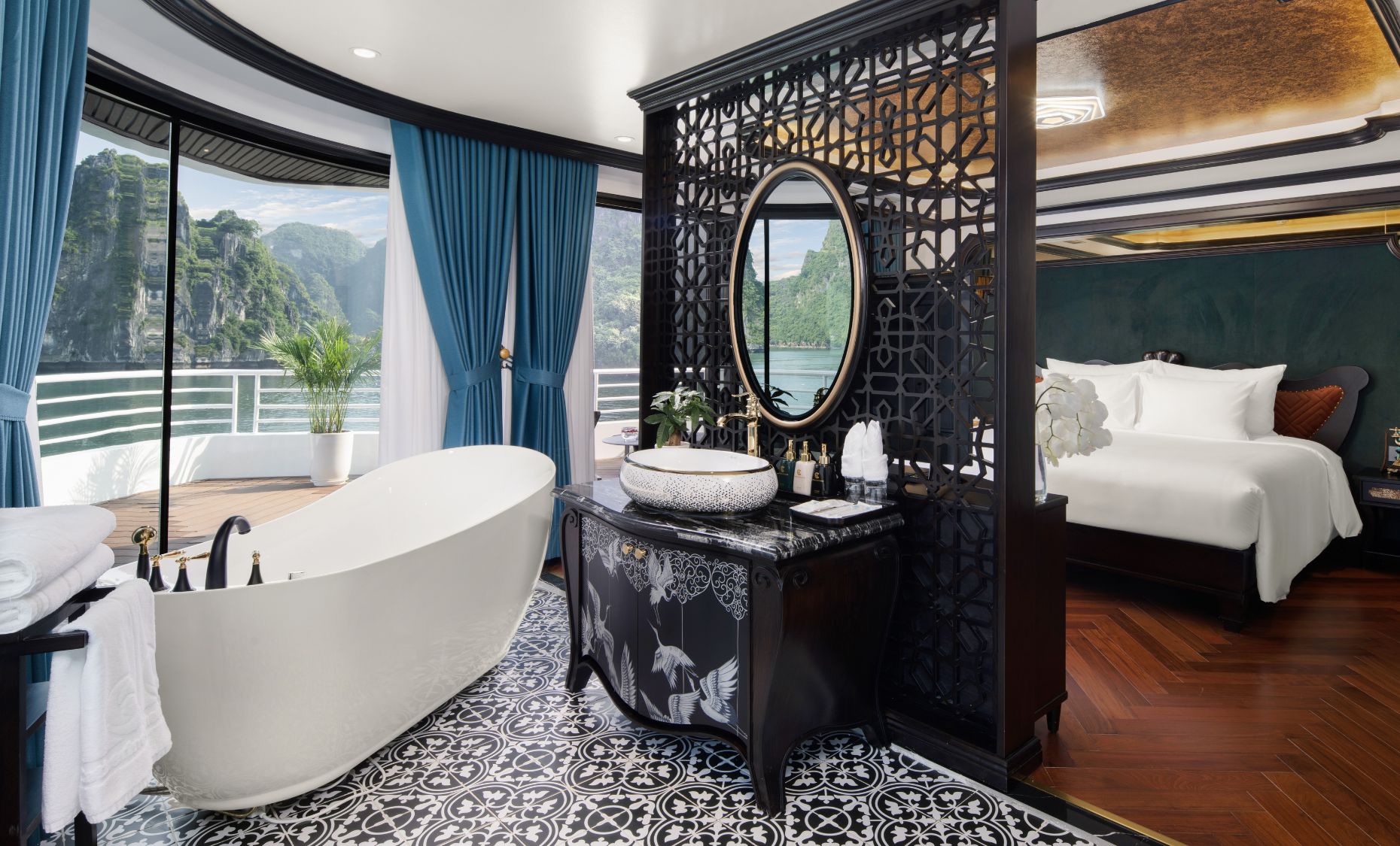Các phòng nghỉ có diện tích từ 40m2 đến 200m2 đều sở hữu ban công riêng và bồn tắm view Vịnh tuyệt hảo. Nội thất trong phòng và các khu vực tiện ích của du thuyền được thiết kế đồng nhất theo phong cách Indochine, là sự giao thoa hoàn hảo của tinh hoa kiến trúc Đông – Tây kết hợp cùng phòng cách Á Đông đầy nghệ thuật,